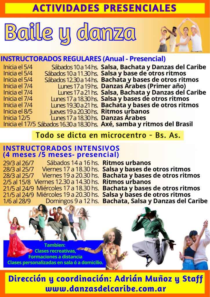 Instructorados y cursos presenciales de iniciación intensivos para aquellos que desean aprender en un corto plazo las bases del ritmo de su interés. Pueden realizarse con fines recreativos y/ó con fines profesionales, para esto último el alumno debe rendir exámenes para acceder a la certificación correspondiente.