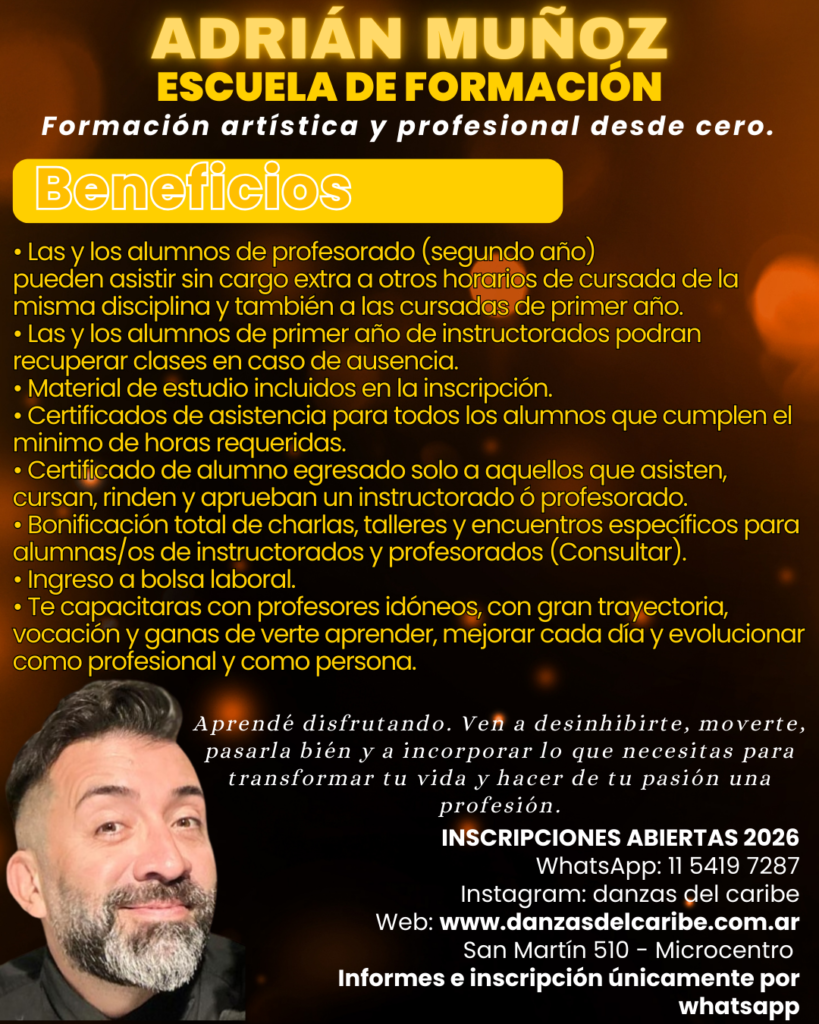 Comencé mi camino en el arte en 1994 y desde 1998 me dedico a la enseñanza, una vocación que me apasiona profundamente. A lo largo de estos años he trabajado como jurado, coreógrafo, animador y productor, sin dejar nunca de capacitarme y seguir aprendiendo.